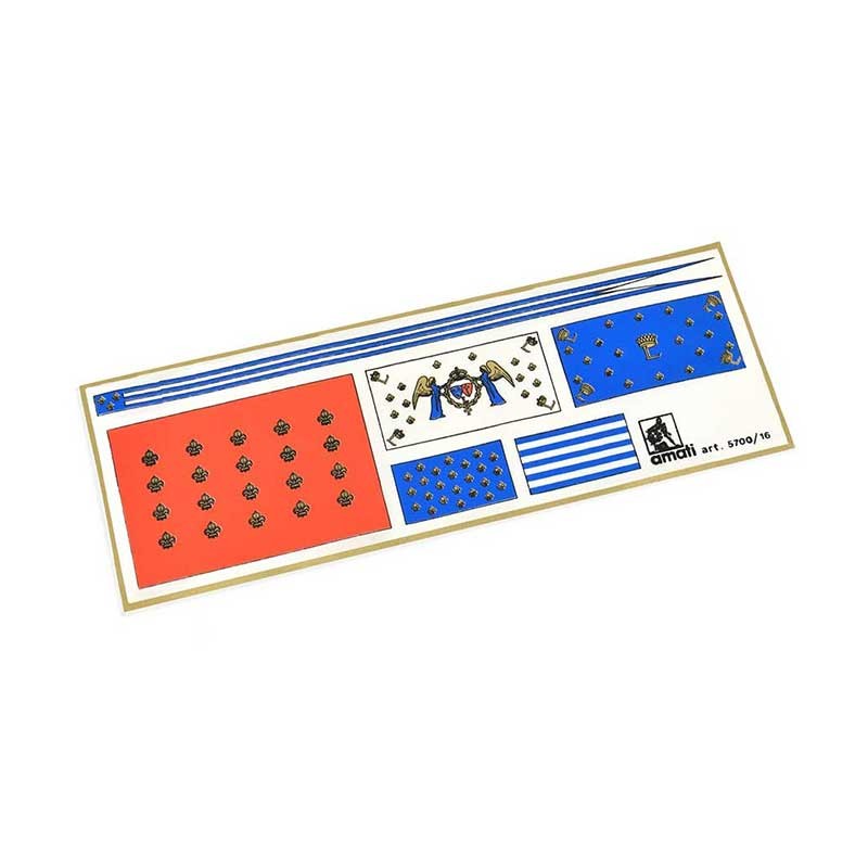 Set completo de banderas Amati 5700/16 compuesto por 6 enseñas para el barco francés Saint Louis del siglo XVII.