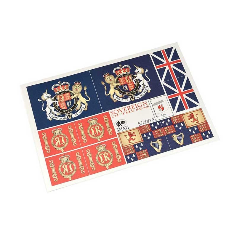 Set completo de banderas Amati a escala 1:78 para el barco de guerra Soberano de los Mares, un navío de línea de la Armada Inglesa de 1637.
