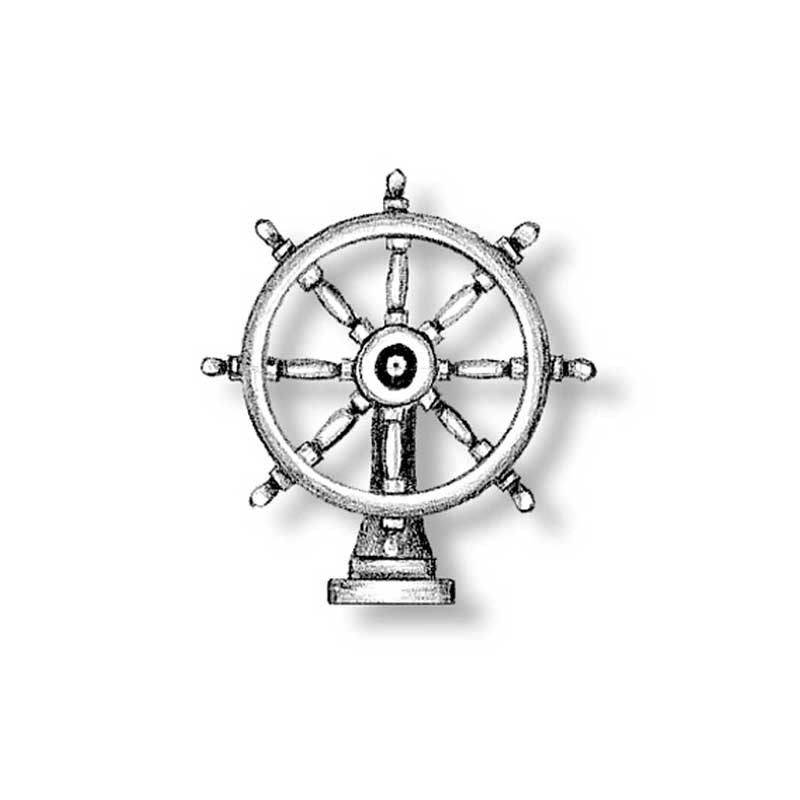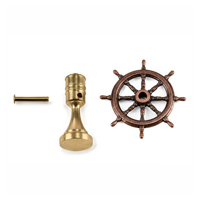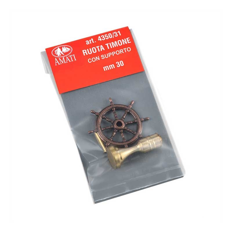 Rueda de timón en metal envejecido con soporte de latón para modelismo naval.