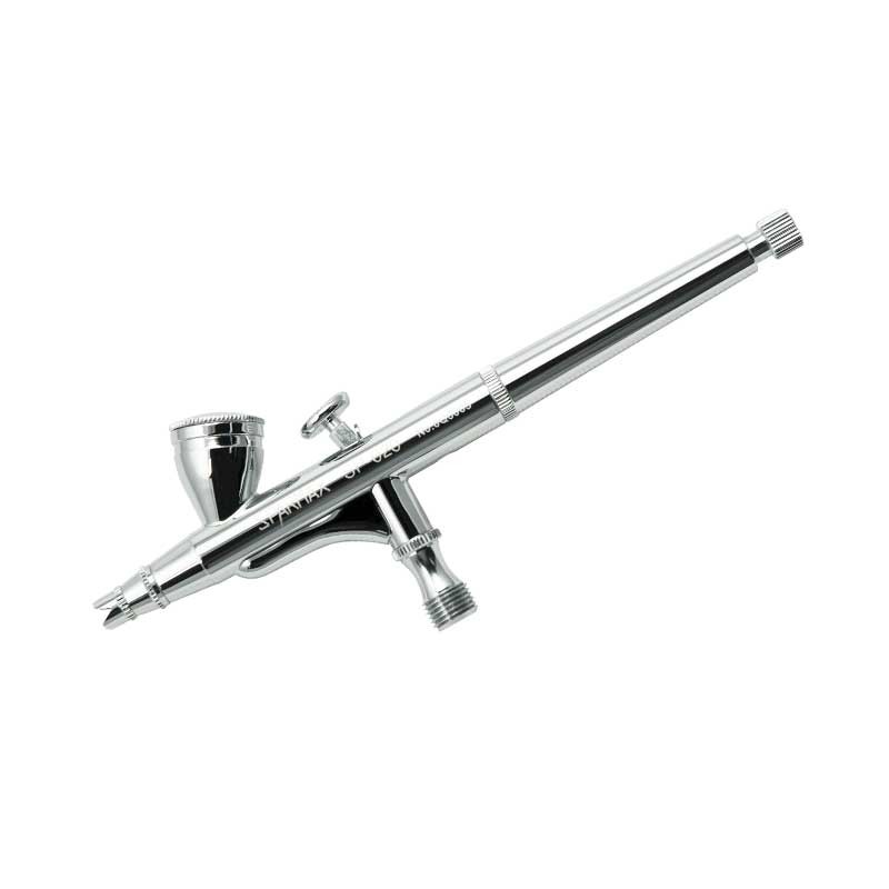 Aerógrafo de gravedad Sparmax SP-020 con sistema de doble acción, boquilla de 0,2 mm y depósito fijo de 2 ml de capacidad.