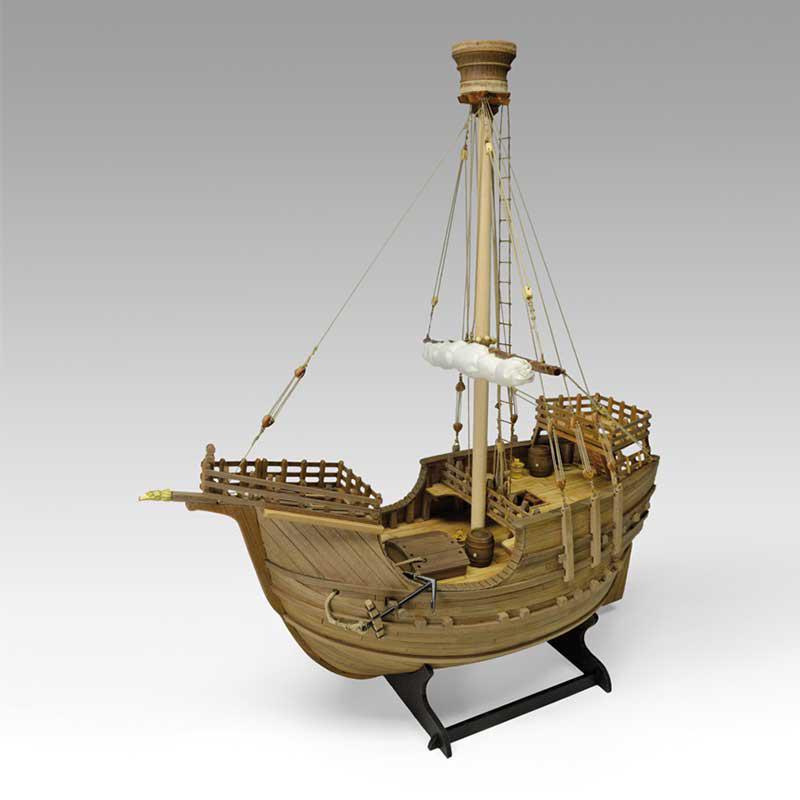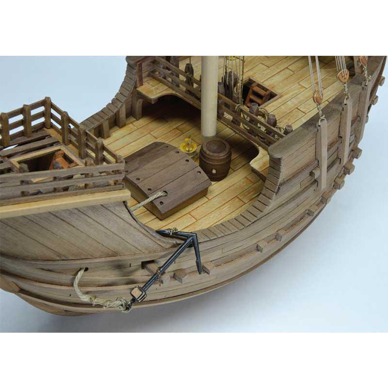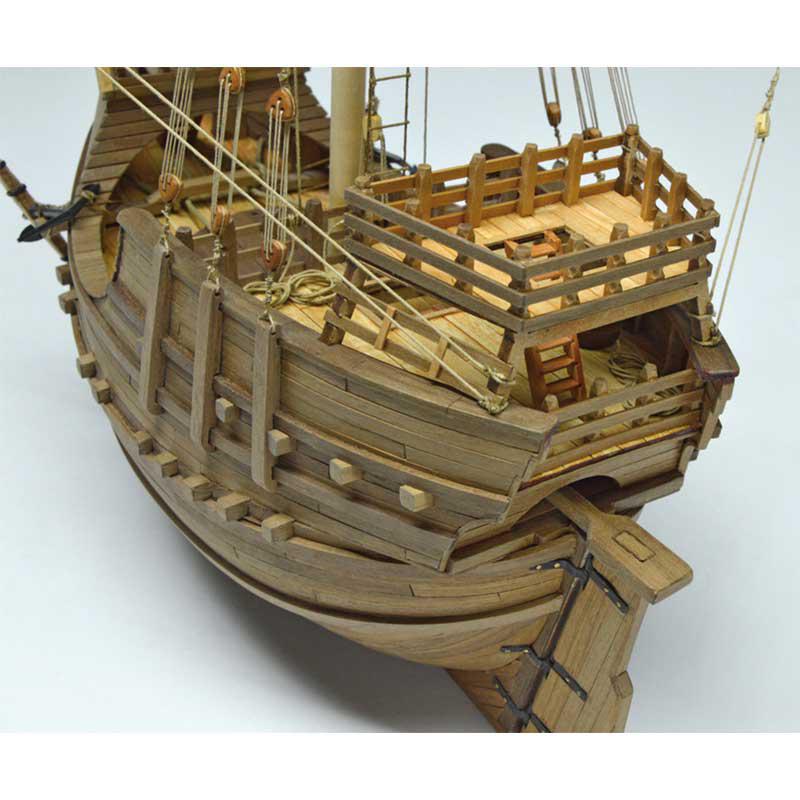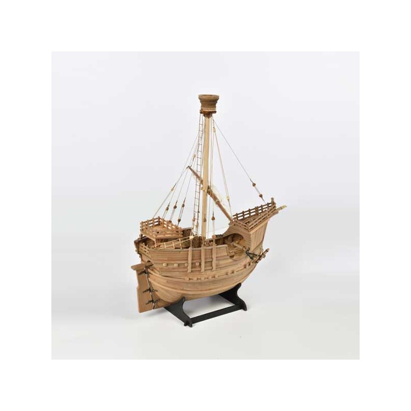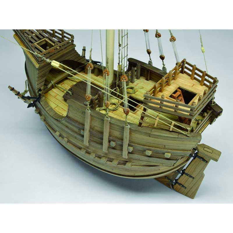 Maqueta en kit reproducción de una Carraca Española, embarcación mercante del siglo XV. Escala 1:60, eslora 41 cm, madera cortada con láser, pequeños accesorios de latón y planos de montaje.