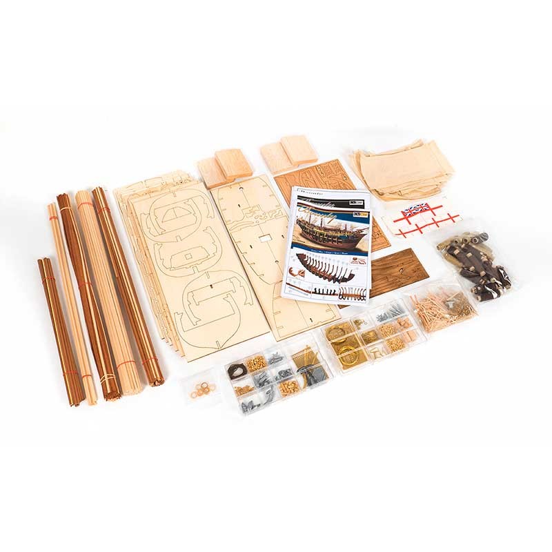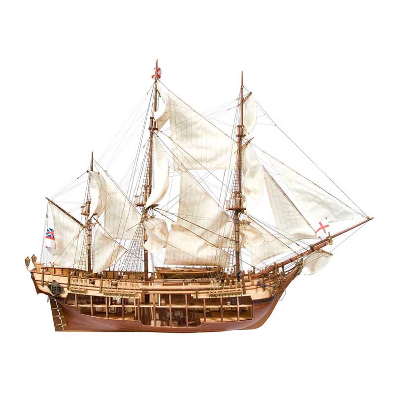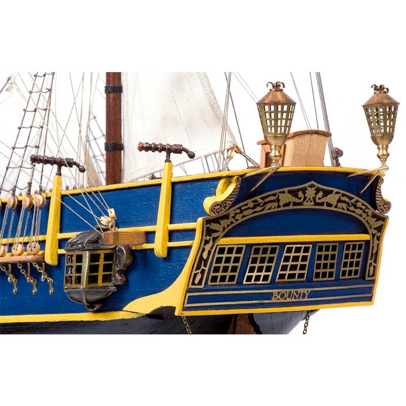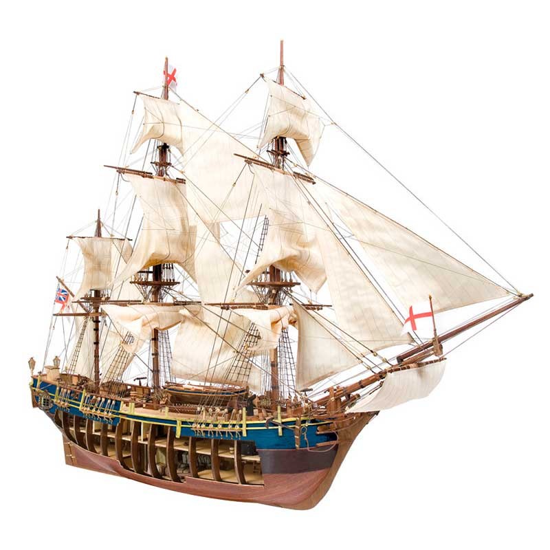 Maqueta de madera en kit del barco HMS Bounty, un buque carguero armado de 1783 que pasó a formar parte de la Armada Británica y famoso por el motín de su tripulación.