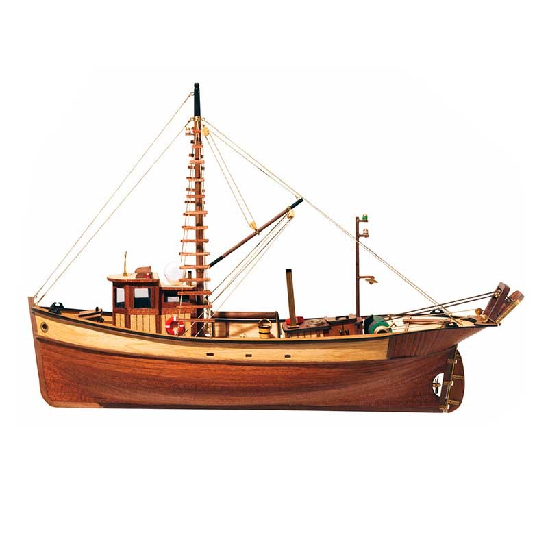 Maqueta de madera en kit del Palamós, un barco dedicado a la pesca de bajura en todo el litoral Mediterráneo. Tiene una eslora de 410 mm y está a escala 1:45.