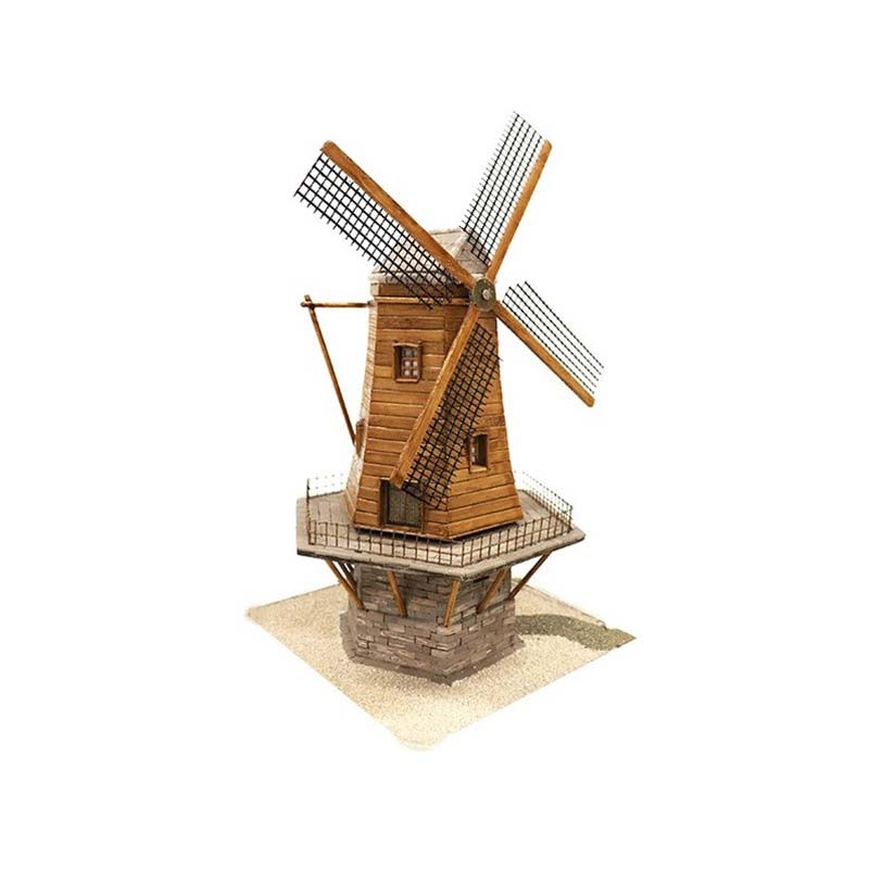 Kit de construcción a escala 1:76 de un molino holandés. Incluye piezas de cerámica, madera, plástico y material decorativo para la base.