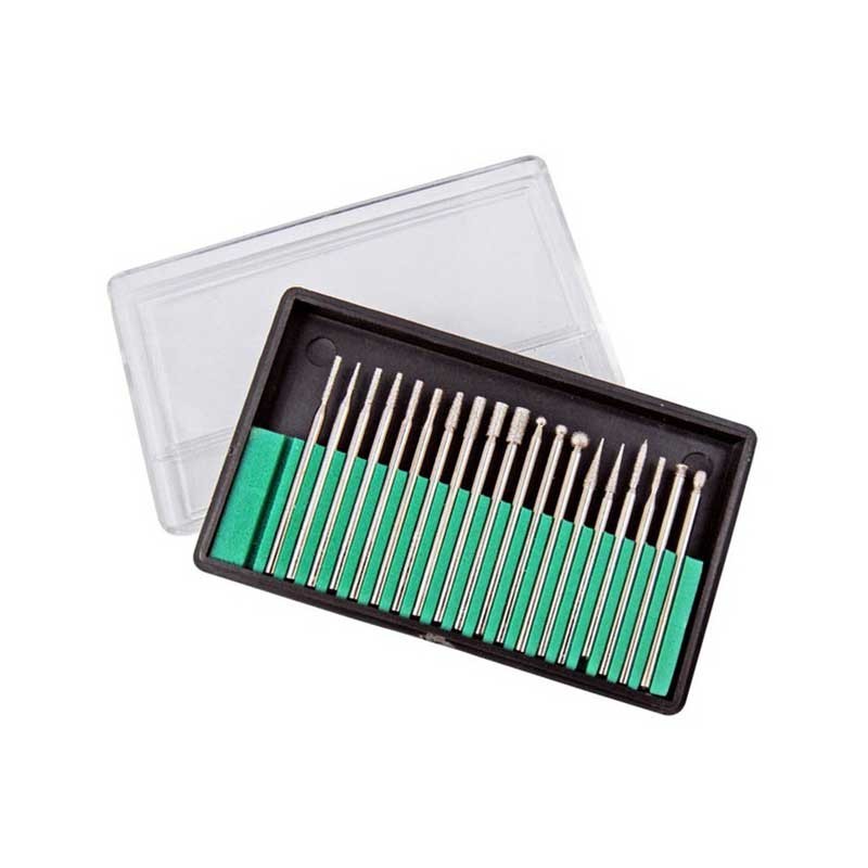 Conjunto de 20 fresas diamantadas para modelismo, con puntas de distintos tipos y medidas, y vástago de 2,3 mm diámetro.