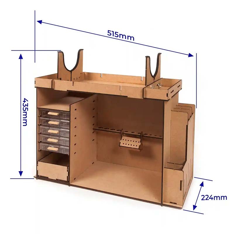 Le permitirá guardar todas las herramientas junto con la maqueta, en un espacio reducido y ordenado. En este kit mueble taller organizador, encontrará todas las piezas de madera precortadas, listas para montar su propio taller. Incluye también cajones de plástico con compartimentos para guardar y ordenar las piezas de la maqueta.