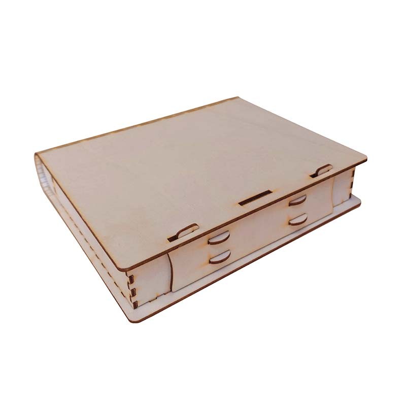Maqueta de madera de una cajita porta-objetos con forma de libro hecha de contrachapado de tilo cortado a láser listo para ensamblar.