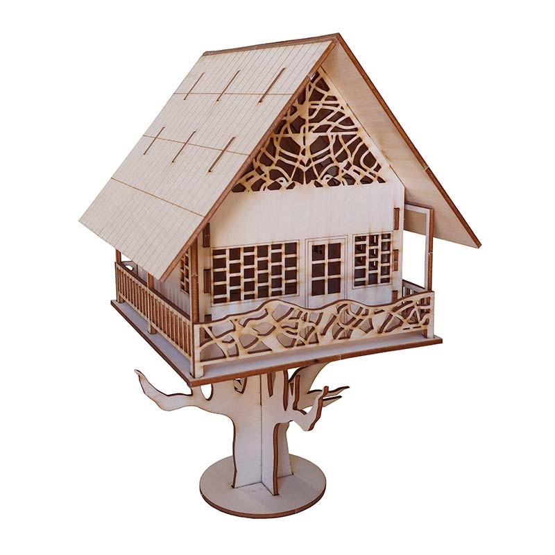 Maqueta de madera de una casita árbol hecha de contrachapado de tilo cortado a láser listo para ensamblar.