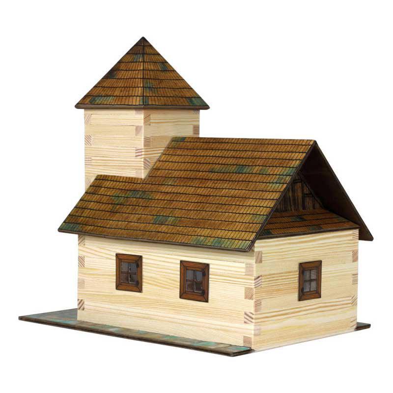 Maqueta en kit fabricada con pequeños listones de madera de pino de 9x9 mm. Incluye bote de cola, lija, partes decorativas e instrucciones.
