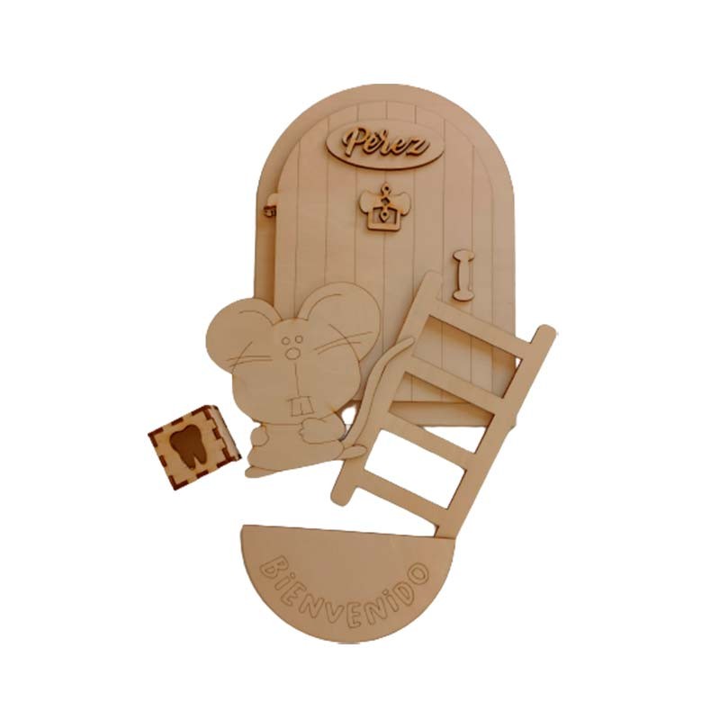 Set de madera que simula la puerta de entrada a la casa del ratoncito Pérez hecha de contrachapado de tilo cortado a láser listo para ensamblar.