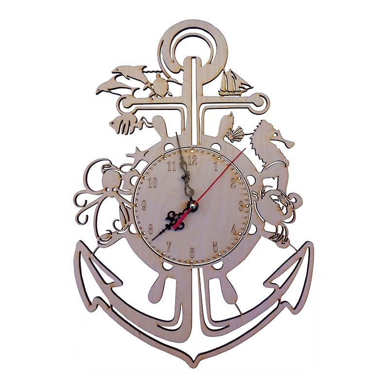 Maqueta mecánica de madera para construir un reloj de pared con forma de ancla con mecanismo y manillas hecha de contrachapado de tilo cortado a láser listo para ensamblar.