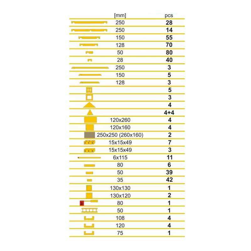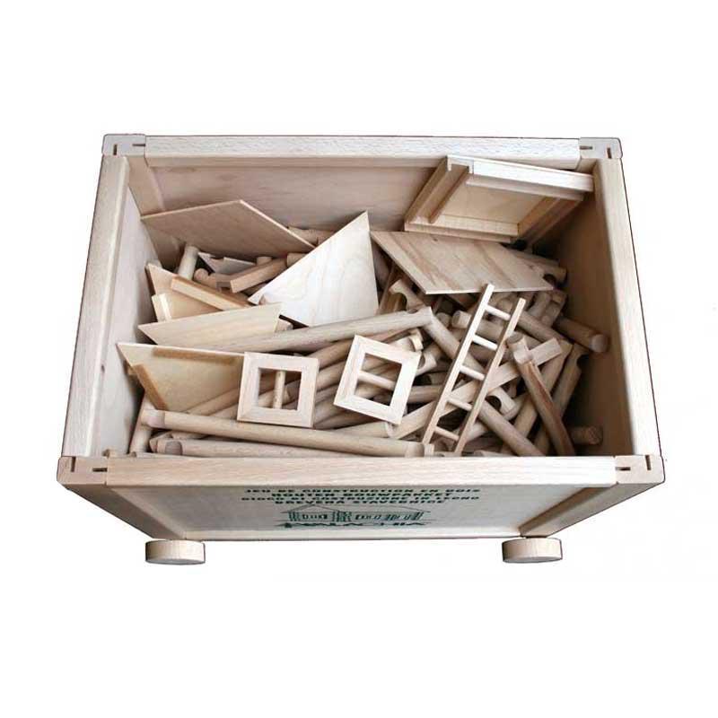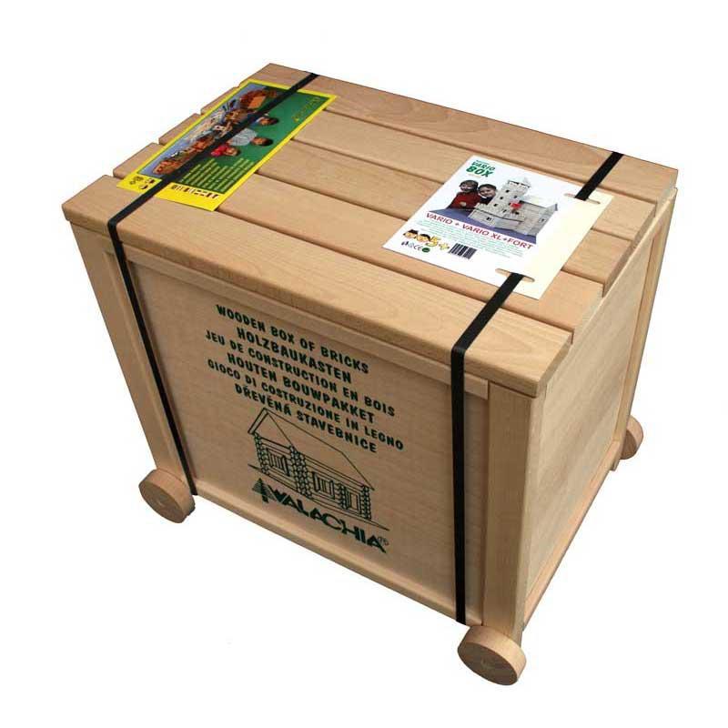 El contenido del Vario Box incluye los kits Vario 72 piezas, Vario XL 184 piezas y Fuerte Vario 194 piezas. Todas las piezas van sueltas dentro de su cajón contenedor de madera con ruedas.