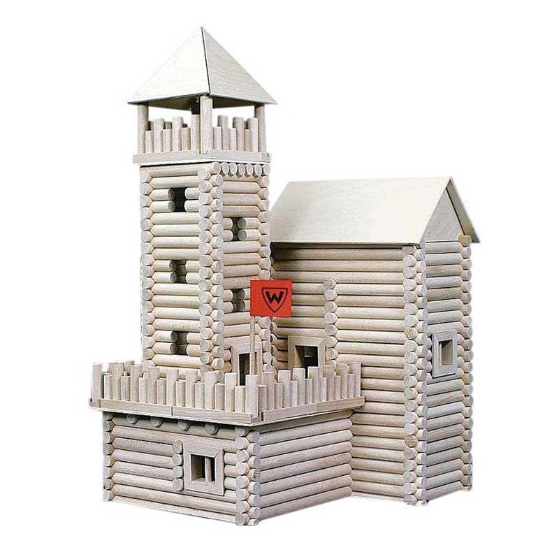 Juego de construcción fabricado a partir de pequeños troncos de madera de haya natural de 15 mm de diámetro y diferentes longitudes además de otras piezas también en madera como tejados, marcos de ventanas y otros elementos decorativos. Las piezas van fresadas en sus extremos para que se puedan encajar fácilmente unas con otras.