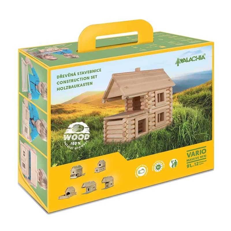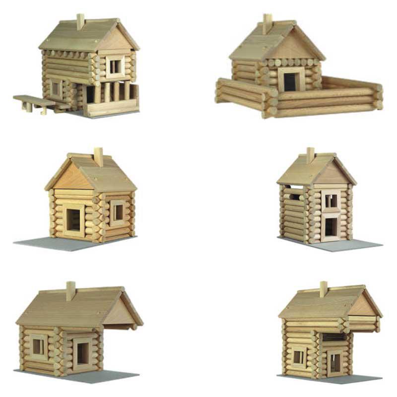 Juego de construcción fabricado a partir de pequeños troncos de madera de haya natural de 15 mm de diámetro y diferentes longitudes además de otras piezas también en madera como tejados, marcos de ventanas y otros elementos decorativos. Las piezas van fresadas en sus extremos para que se puedan encajar fácilmente unas con otras.