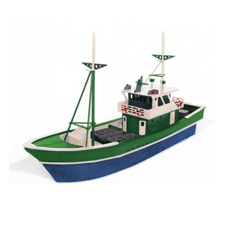 Maqueta en kit de un barco pesquero con 162 piezas de madera de haya de alta calidad. Diseño cuidado para que cada pieza encaje con precisión.