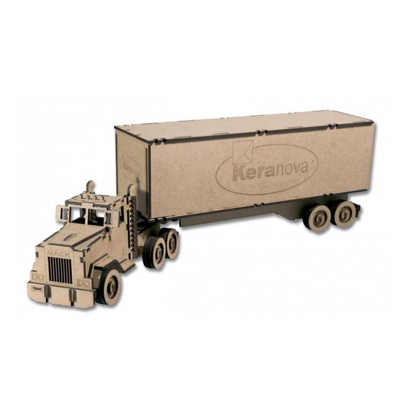Maqueta en kit de un camión con semirremolque de 116 piezas de madera DM de alta calidad. Diseño cuidado para que cada pieza encaje con precisión.