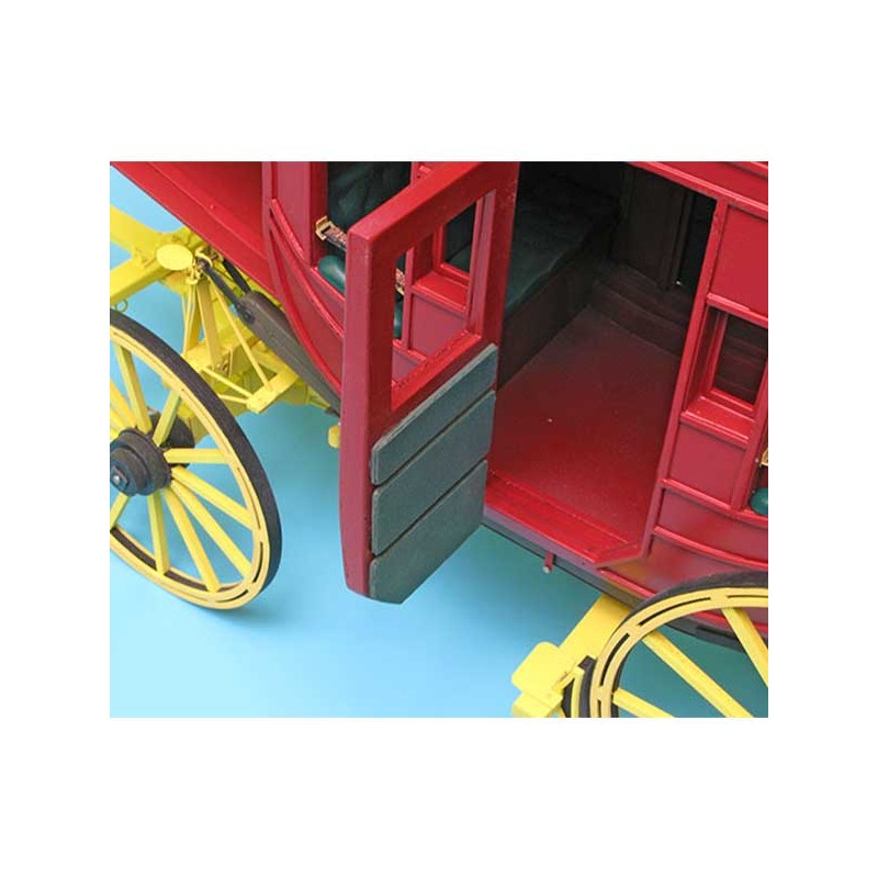 Maqueta de madera en kit de un carruaje o diligencia americana Wells Fargo a escala 1:10 como las utilizadas en el Lejano Oeste.