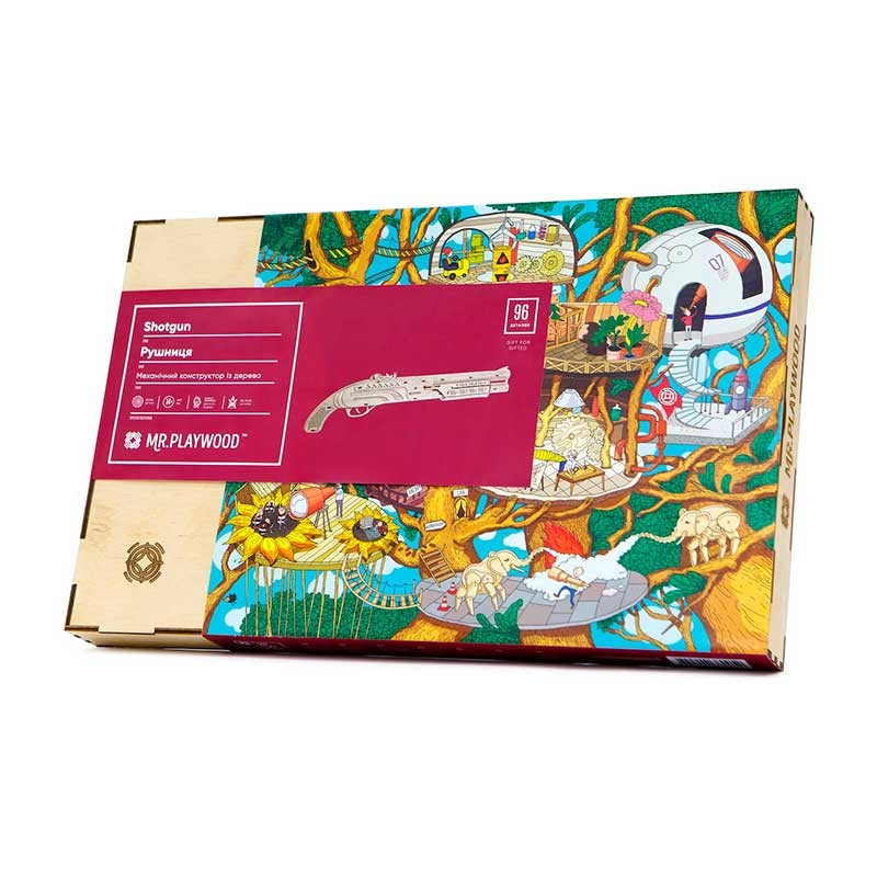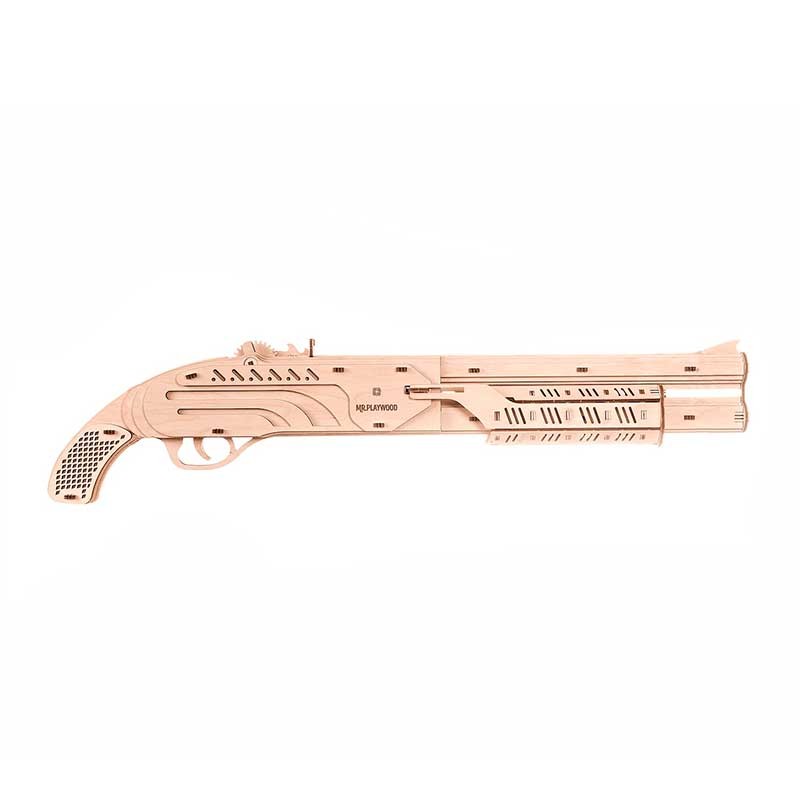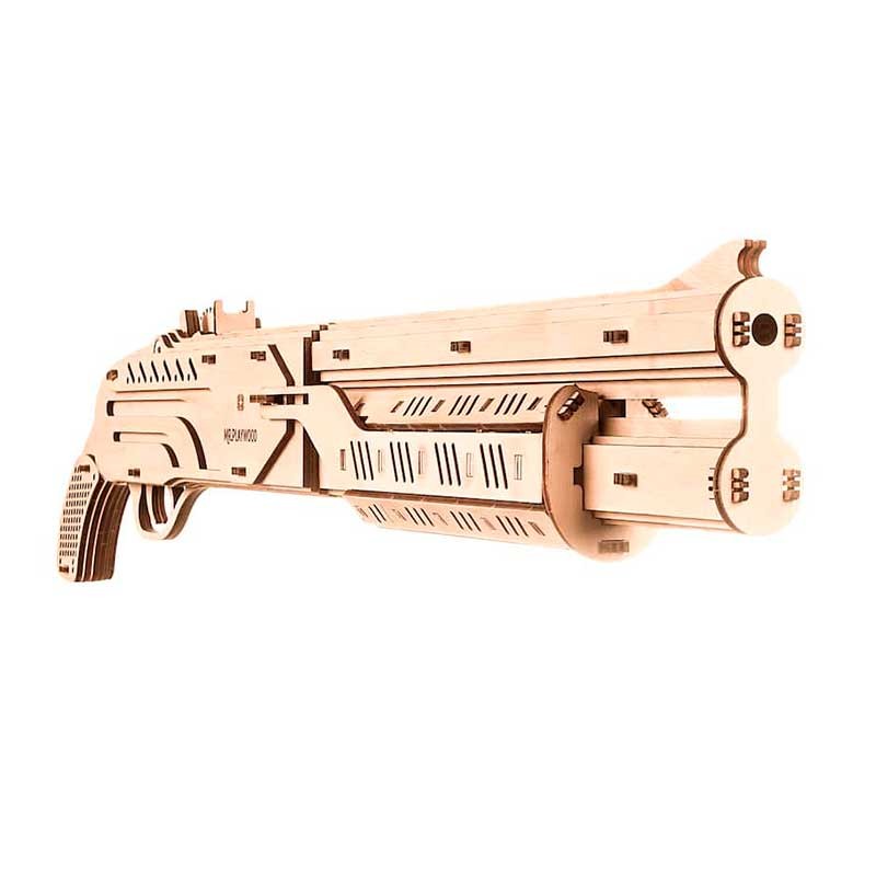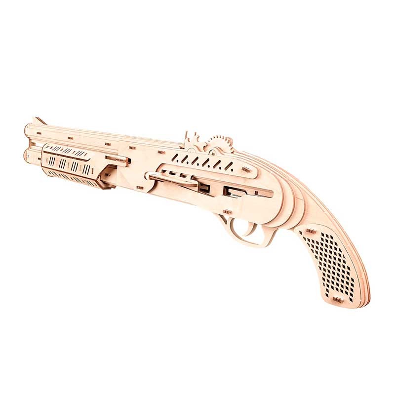 Modelo mecánico 3D para construir una escopeta de juguete a partir de piezas de madera contrachapada de gran calidad.