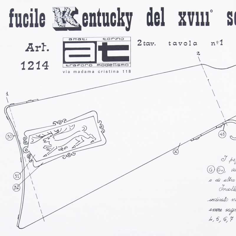 Planos Amati para la construcción de un fusil Kentucky del siglo XVIII. Incluye planos técnicos e instrucciones de montaje.